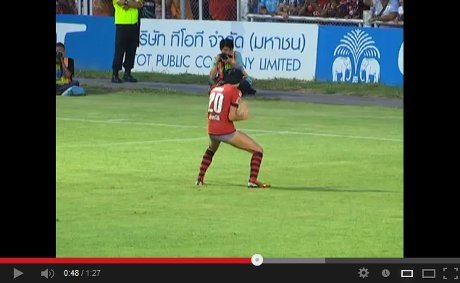 Kegembiraan Mario Gjurovski usai mencetak gol ke gawang lawan ia rayakan dengan melepas celana. Ia sukses menuai tawa penonton, meski juga harus rela mendapat kartu merah dari wasit.