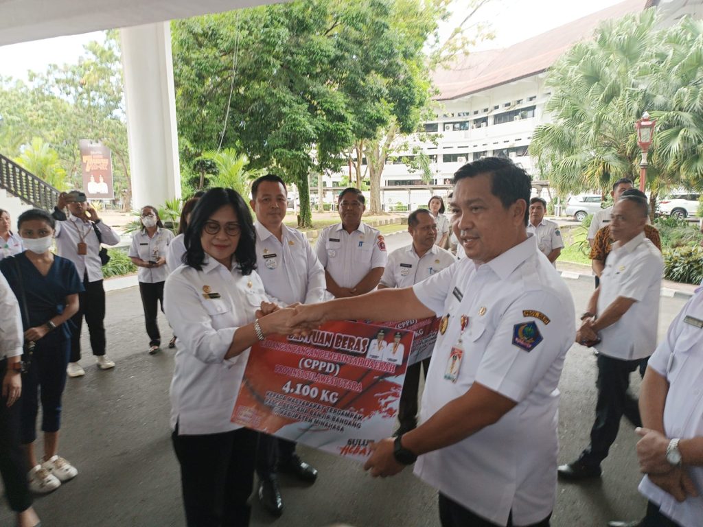 Manado – Wakil Gubernur Sulawesi Utara (Sulut) Steven Kandouw menyerahkan secara simbolis bantuan beras cadangan pangan Pemerintah Daerah Pemerintah Provinsi (Pemprov) Sulut, Rabu (15/03/2023) di loby kantor gubernur.