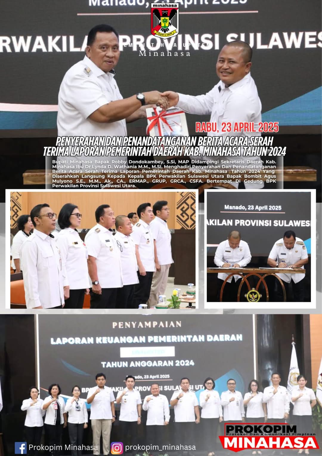 Manado – Pemerintah Kabupaten (Pemkab) Minahasa menyerahkan Laporan Keuangan Pemerintah Daerah (LKPD) Kabupaten Minahasa Tahun 2024, kepada Badan Pemeriksa Keuangan (BPK) Repoblik Indonesia Perwakilan Sulawesi Utara, Rabu (23/04), di ruang rapat Kantor BPK-RI, Jl 17 Agustus, Kota Manado.