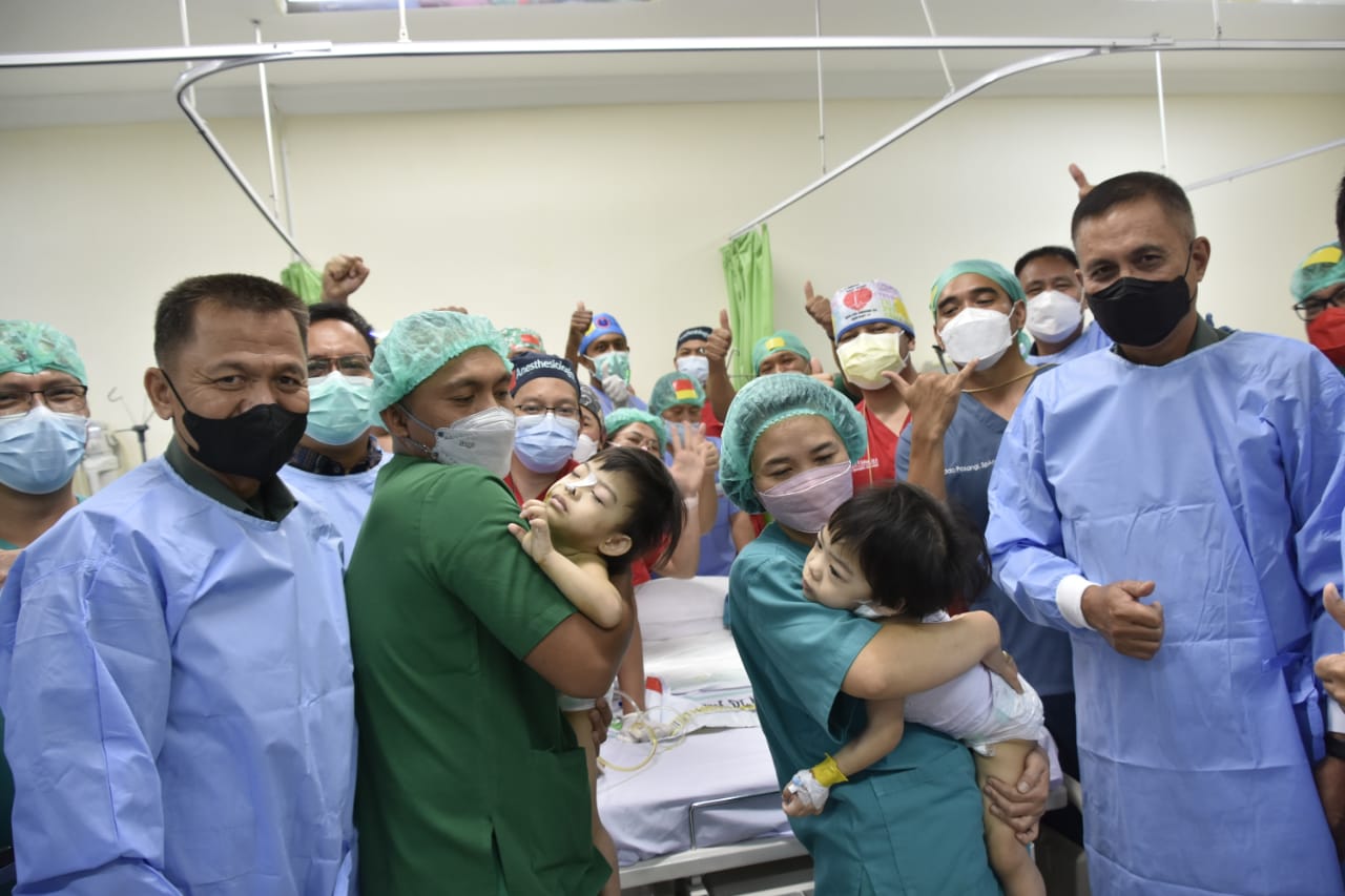 Manado – Proses operasi pemisahan bayi kembar siam Joana dan Jofelin Lumowa, yang adalah bayi kembar dari personel Kodim 1302/Minahasa, Sersan Dua Fredrik Lumowa, di RSUP Prof Kandouw Manado, sukses dan berhasil, Kamis (21/04).