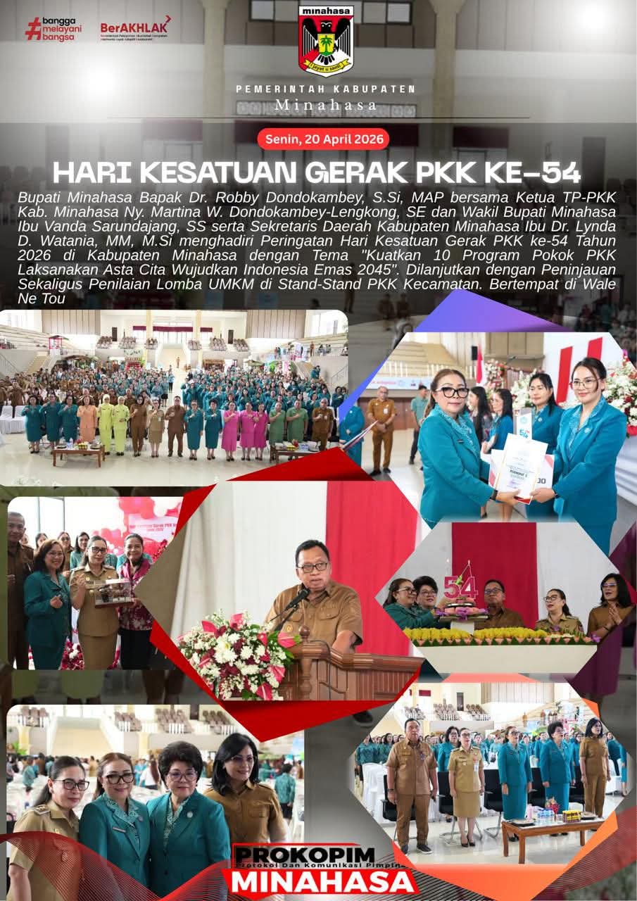 Minahasa – Tim Penggerak Pemberdayaan Kesejahteraan Keluarga (TP-PKK) Kabupaten Minahasa, menggelar Peringatan Hari Kesatuan Gerak (HKG) PKK ke-54, tahun 2026, bertempat di Gedung Wale Ne Tou, Senin (20/04).